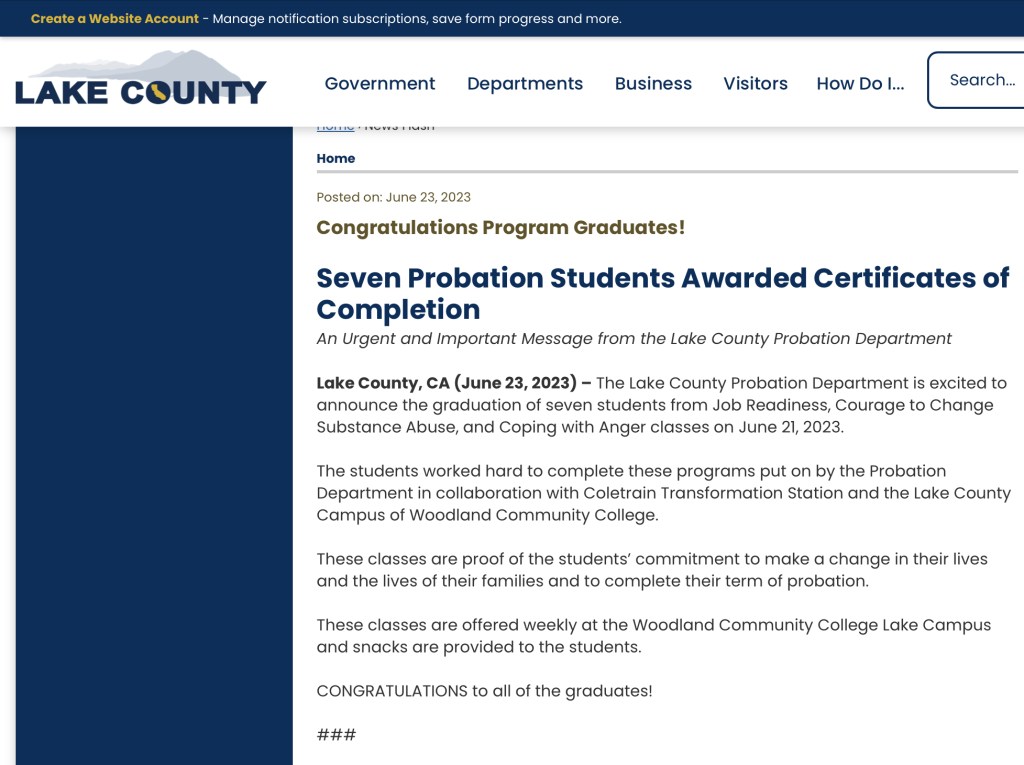 Congratulations CTS for receiving a contract Lake County Probation Department and Lake County Campus of Woodland Community College. We are excited to help individuals transform towards recovery.